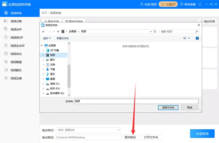 4、然后就是设置转换输出视频的保存位置了。点击软件下面的更改路径,然后就是在弹出的对话选择框中选择桌面为保存地址就行了。或者可以把地址直接复制到地址框中也能起到相同的作用。