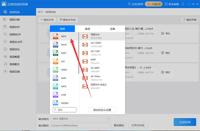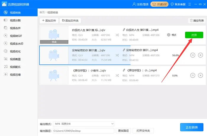 6、最后都设置完成后就可以点击软件中的全部转换,然后再等待软件把转换的进度条走到100%,那么就可以在保存视频的位置(例如桌面上)看到转换成功的mp4视频文件了。点击打开也能找到。