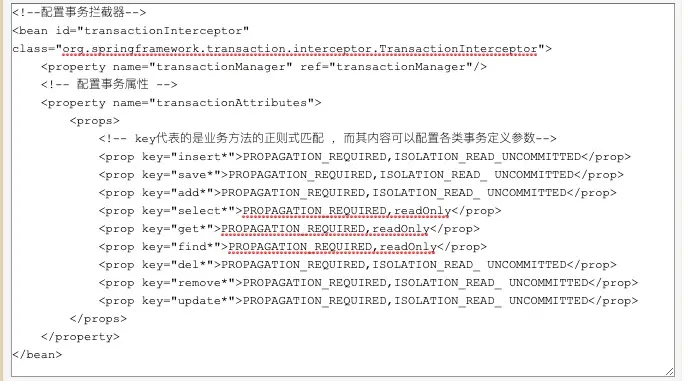 <tx:annotation-driven transaction-manager="transactionManager"/> 利用XML配置事务管理器的方法很多,但是也不常用,更多的时候我们会采用注解的方式来实现事务,它需要一个事务拦截器--TransactionInterceptor,配置事务拦截器。