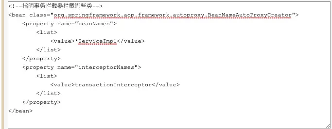 还需要告诉Spring哪些类要使用事务拦截器进行拦截,为此我们再配置一个类BeanNameAutoProxyCreator。