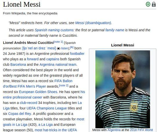 不用过多介绍,大家都知道梅西。即使是那些不关注足球的人,也听说过这位最伟大球员在辉煌。下面是他的维基百科页面: