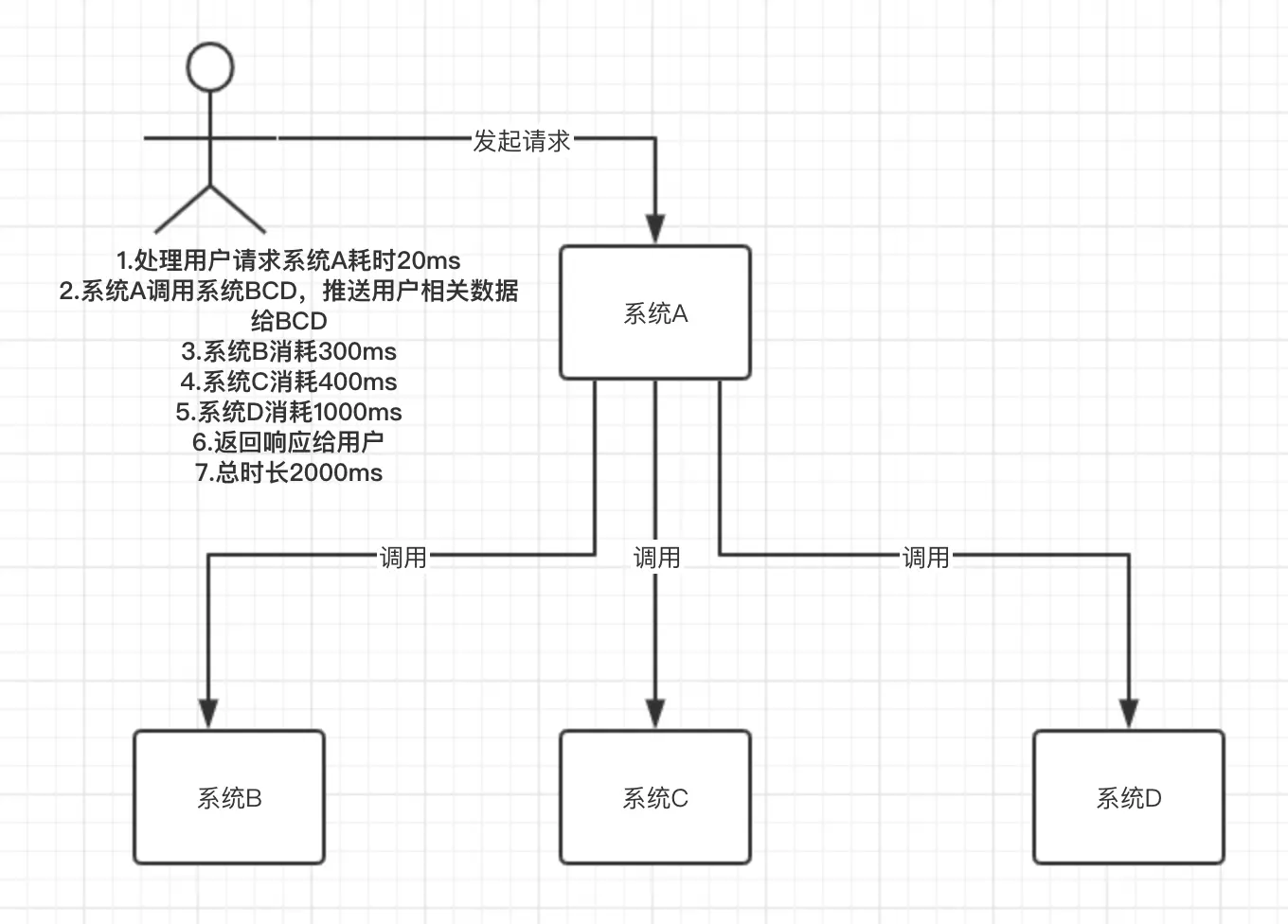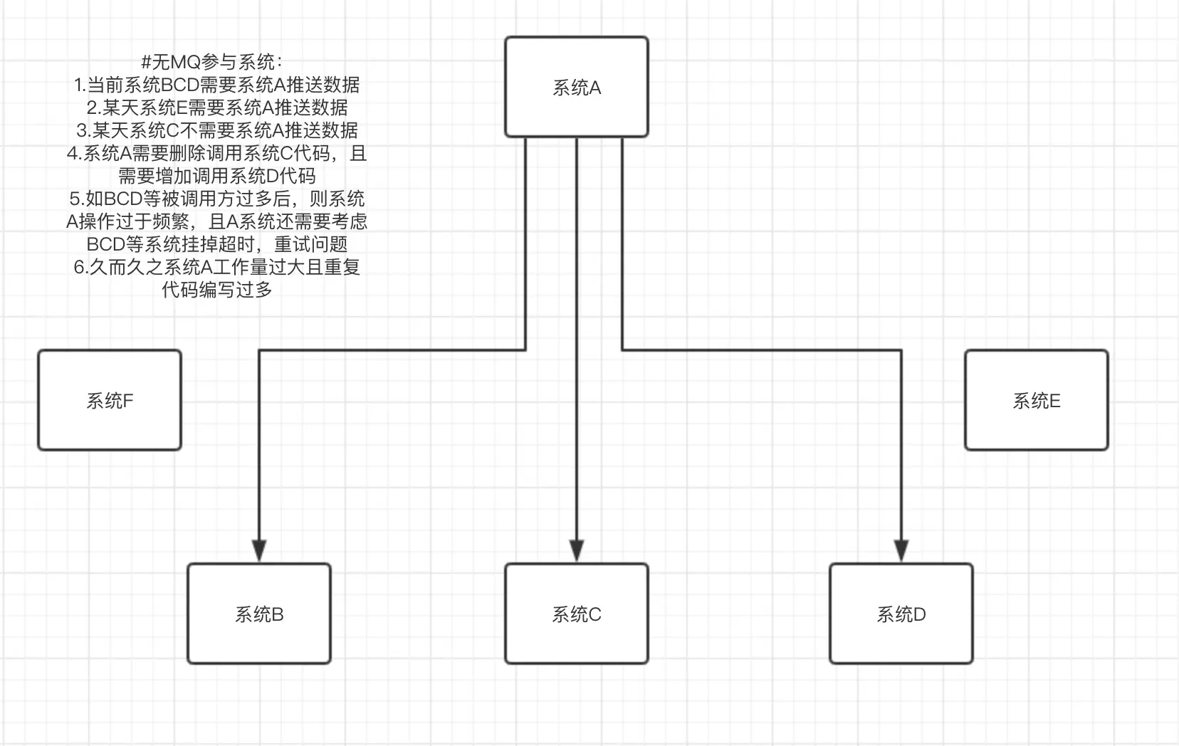 - MQ未参与系统,用户高并发请求时,消峰处理