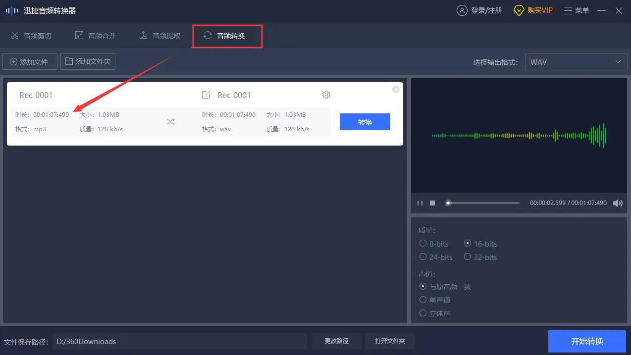 5、把这些工作都完成后就可以转换之前编辑和修改好的音频文件了,我们先点击这款软件的右侧下方的开始转换,用这个按钮转换自己编辑好的音频文件。一般音频的容量不大我们只需要稍等一会就可以了