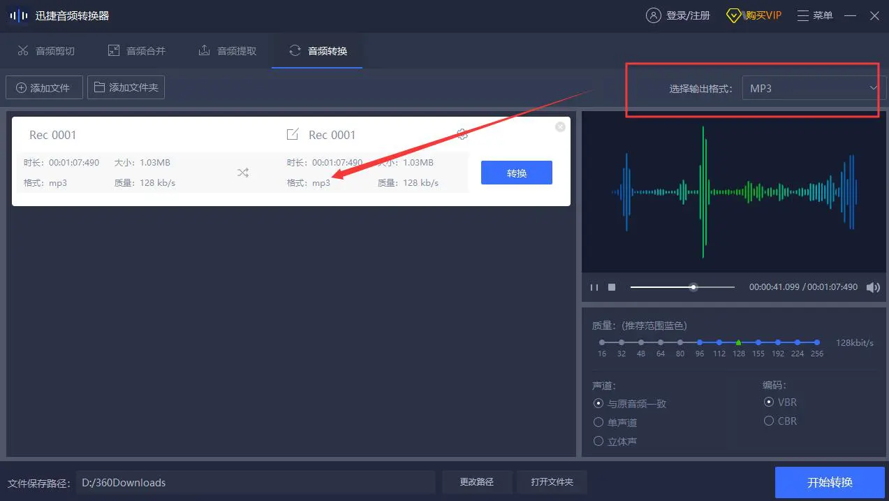 3、我们也可以在软件的右侧的操作间中对拉进去的音频文件进行编辑,设置好音频文件在转换出来的质量、声道参数,当我们的参数也设置好之后就可以点击开始转换了