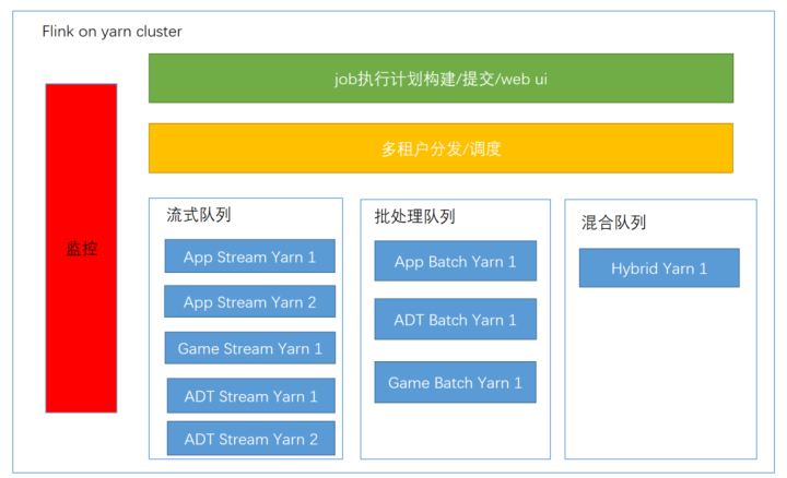 如图 5,未来的 Flink on yarn cluster 将可以完成流式计算和批处理计算,集群的使用者可以通过一个构建 service 来完成 stream/batch job 的构建、优化和提交,job 提交后,根据使用者所在的业务团队及服务客户的业务量分发到不同的 yarn 队列中,此外,集群需要一个完善的监控系统,采集用户的提交记录、各个队列的流量及负载、各个 job 的运行时指标等等,并接入公司的 OWL。