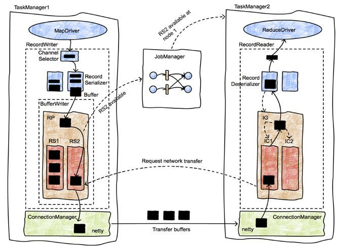 其过程简述如下:上游的 operator 产生的结果会通过 RecordWriter 序列化,然后申请 BufferPool 中的 Buffer 并将序列化后的结果写入 Buffer,此后 Buffer 会被加入 ResultPartition 的 ResultSubPartition 中。ResultSubPartition 中的 Buffer 会通过 Netty 传输至下一级的 operator 的 InputGate 的 InputChannel 中,同样的,Buffer 进入 InputChannel 前同样需要到下一级 operator 所在的 TaskManager 的 BufferPool 申请,RecordReader 读取 Buffer 并将其中的数据反序列化。BufferPool 是有限的,在 BufferPool 为空时 RecordWriter / RecordReader 所在的线程会在申请 Buffer 的过程中等待一段时间,具体原理可以参考:[1], [2]。