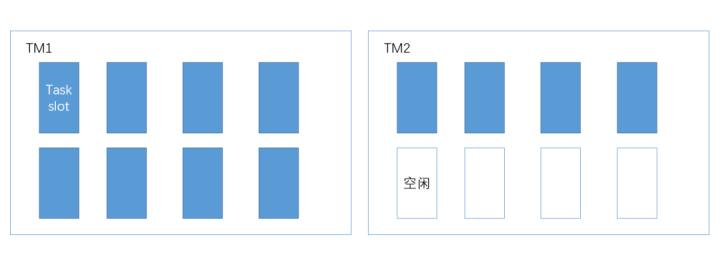 结合我们之前的使用经验,Flink 的 standalone cluster 在发布具体的 job 时,会有一定的随机性。举个例子,如果当前集群总共有 2 台 8 核的机器用以部署 TaskManager,每台机器上一个 TaskManager 实例,每个 TaskManager 的 TaskSlot 为 8,而我们的 job 的并行度为 12,那么就有可能会出现下图的现象: