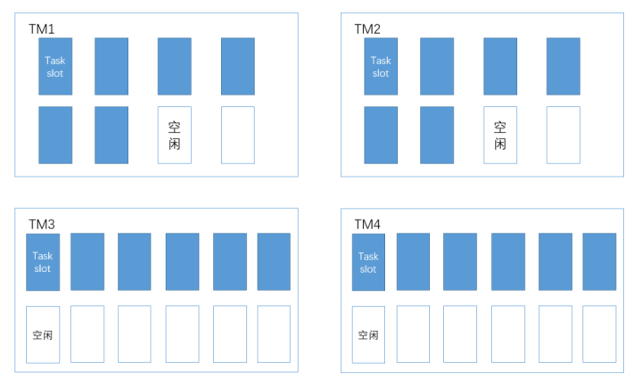 第一个 TaskManager 的 slot 全被占满,而第二个 TaskManager 只使用了一半的资源!资源严重不平衡,随着 job 处理的流量加大,一定会造成 TM1 上的 task 消费速度慢,而 TM2 上的 task 消费速度远高于 TM1 的 task 的情况。假设业务量的增长迫使我们不得不扩大 job 的并行度为 24,并且扩容2台性能更高的机器(12核),在新的机器上,我们分别部署 slot 数为 12 的 TaskManager。经过扩容后,集群的 TaskSlot 的占用可能会形成下图: