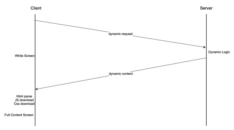 这种方式的优点时一次 html 返回即可包含页面主体内容,不需要浏览器二次请求接口后再用 js 渲染。但这种方式的缺点也比较明显,对于距离服务端远,或者服务端处理时间较长的场景,用户会看到较长时间的白屏。而且即使 html 返回完成了,用户并不会立即看到内容,页面还需要加载前置的 js,css 等资源后,才能看到内容。SSR 模式下的渲染时空图如下: