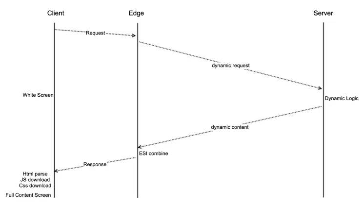 这个方案看起来很美好,可以把静态的部分缓存在 CDN 上了,动态部分在用户请求时会动态请求和拼接。但最关键的问题在于,ESI 模式下,最终返回给用户的首字节,还是要等到所有动态内容在 CDN 上都获取和拼接完成。也就是并没有减少白屏时间,只是减少了 CDN 和服务器之间内容传输的体积,带来的性能优化收益很小。最终效果上与 SSR 区别不大。
