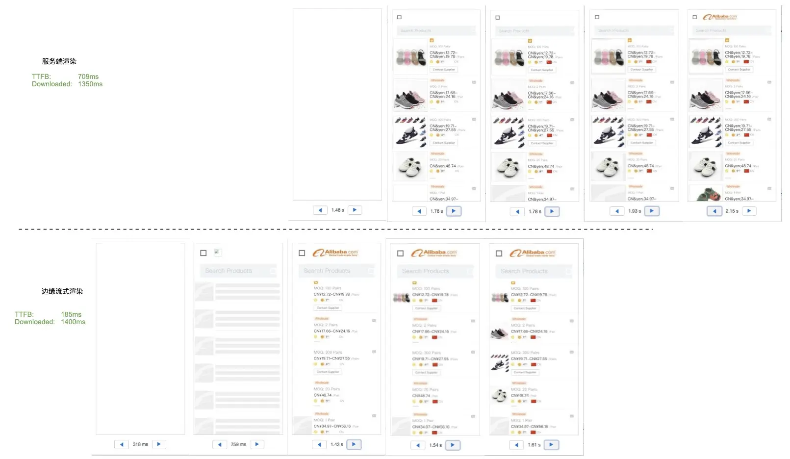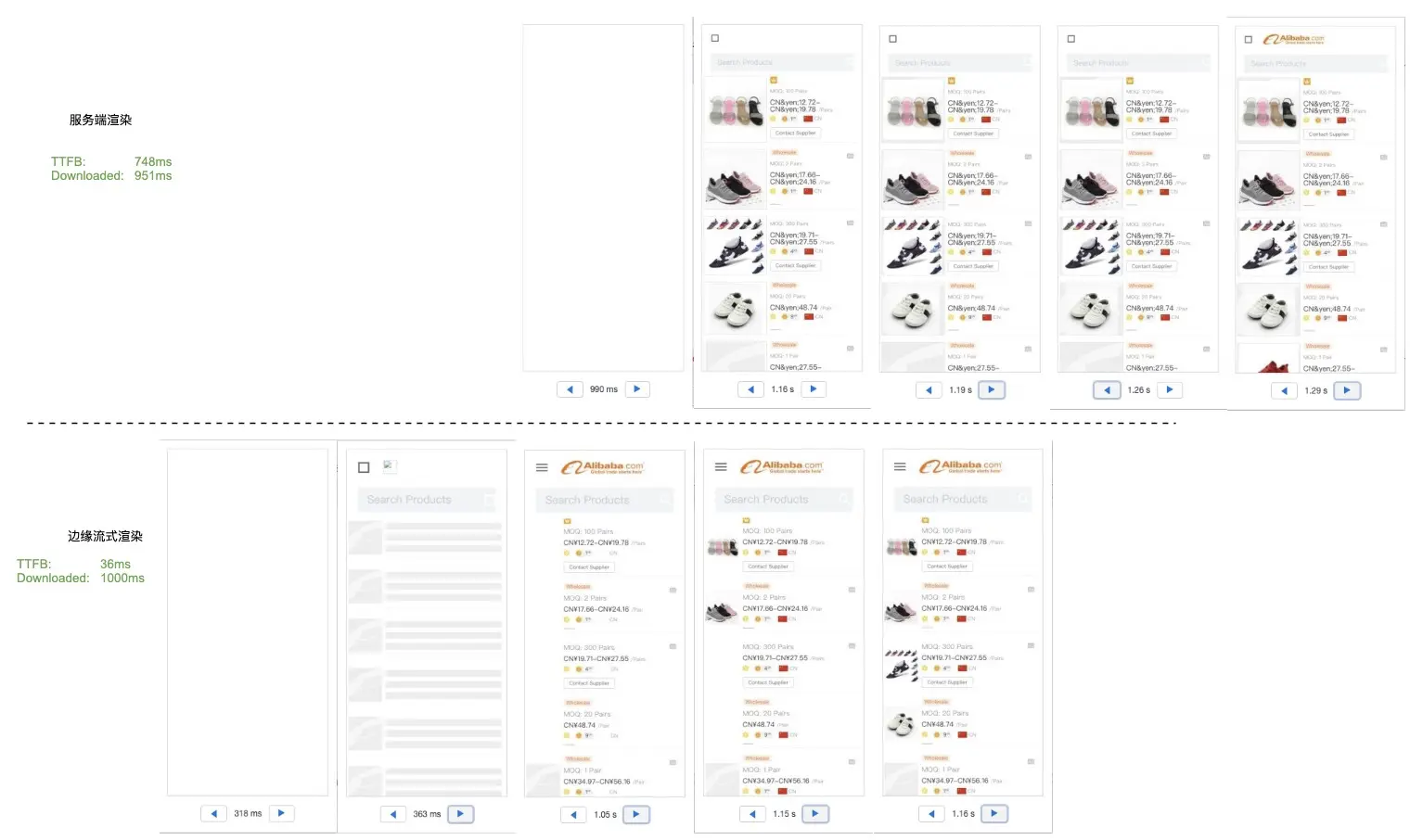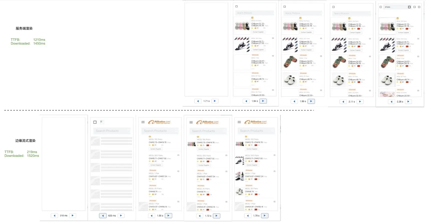 目前在 alicdn 上对主搜页面做了一个 demo (edge-routine.m.alibaba.com/)(因为 demo 页面可能会频繁), 下面是在不同网络(通过 charles 的 network throttle 配置限速)情况下,与原始页面的加载对比: