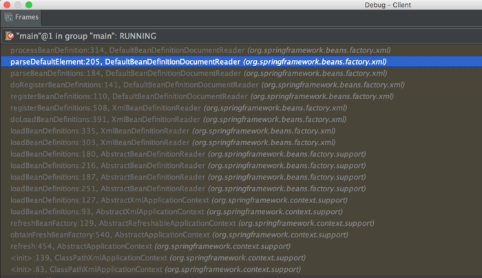 3.源码分析方法:Intellj idea debug 模式下源码追溯通过ClassPathXmlApplicationContext 进行xml 件的读取,从每个堆栈中读取程序的运行信息