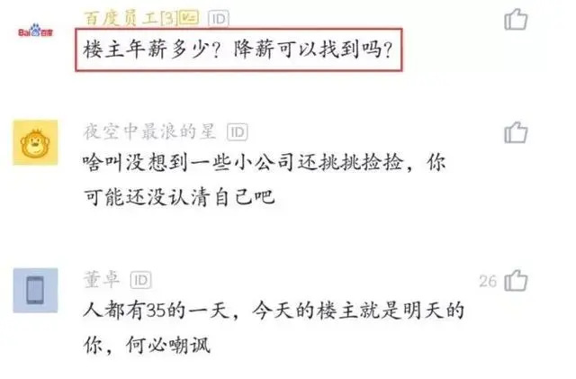 有网友说你可能没认清自己吧,什么叫做小公司还挑挑拣拣你呢?自己能力不够,就抱怨找不到工作,为什么当初不把技术学精呢!有网友对此进行反驳,你也会有35岁那天,程序员的今天就是你的明天,何必要嘲讽呢?