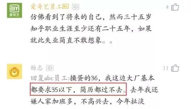 还有网友现在华为,阿里等大公司,只要超过35岁了,连面试机会都不会给你,简历那一关就被卡住了。去年我还说华为加班太多不想去,可现在想去都没机会了。