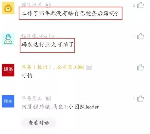 据这位程序员说自己写代码15年了,目前在二线互联网公司当个小主管,可是在最近就公司优化裁掉了。由于自己已经37岁了,找了4个月工作都没有着落,其中包括华为阿里等全部拒绝,原因都是说自己年龄偏大。无奈降薪去小公司,可是小公司的面试官却还说我技术太落后,当时这员工就蒙了!现在上有老下有少,自从被裁后每天都睡不着,很难熬!我们先来看看网友是怎么说的: