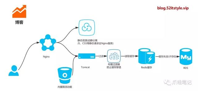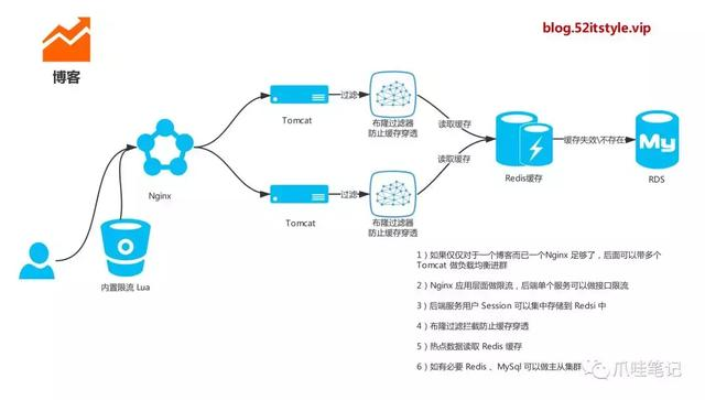 如果仅仅对于一个博客而已一个Nginx 足够了,后面可以带多个Tomcat 做负载均衡进群 Nginx 应用层面做限流,后端单个服务可以做接口限流 后端服务用户 Session 可以集中存储到 Redsi 中 布隆过滤拦截防止缓存穿透 热点数据读取 Redis 缓存 如有必要 Redis 、MySql 可以做主从集群 小结 优化过程可能仅仅是冰山一角,但大体思路差不多就是这个样子,发现问题然后解决问题,本来架构就是演进而来的。