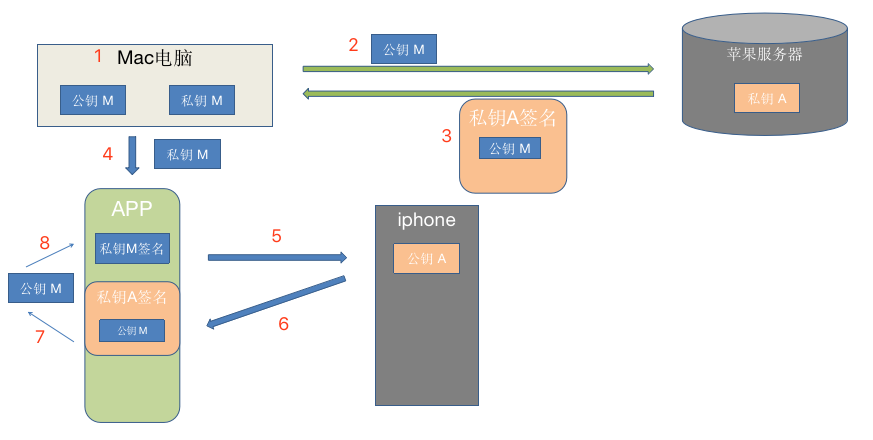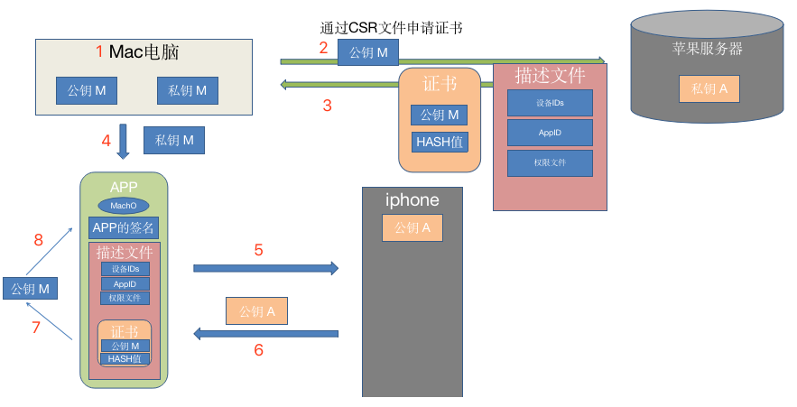 在开发时,编译完一个App后,用本地的私钥M对这个App进行签名,同时把从苹果服务器得到的 Provisioning Profile文件打包进APP里,文件名为embedded.mobileprovision,把 APP 安装到手机上,最后系统进行验证