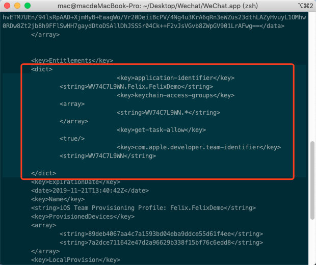 查看原先的描述文件embedded.mobileprovision并复制相应内容