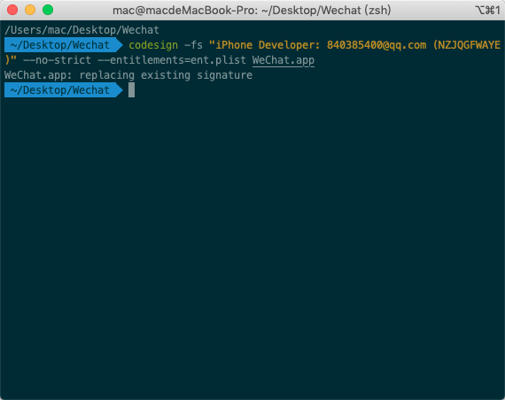$ codesign -fs "iPhone Developer: 840385400@qq.com (NZJQGFWAYE)" --no-strict --entitlements=ent.plist WeChat.app