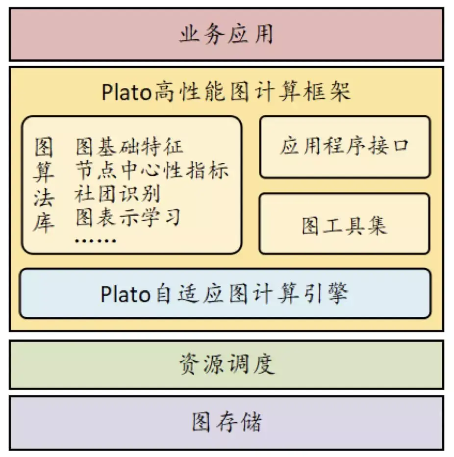 在计算引擎之上,Plato还为算法设计者或具体的业务提供多层次接口:从底层的API,到图算法库,再到为具体业务量身打造的“解决方案”——图工具集。