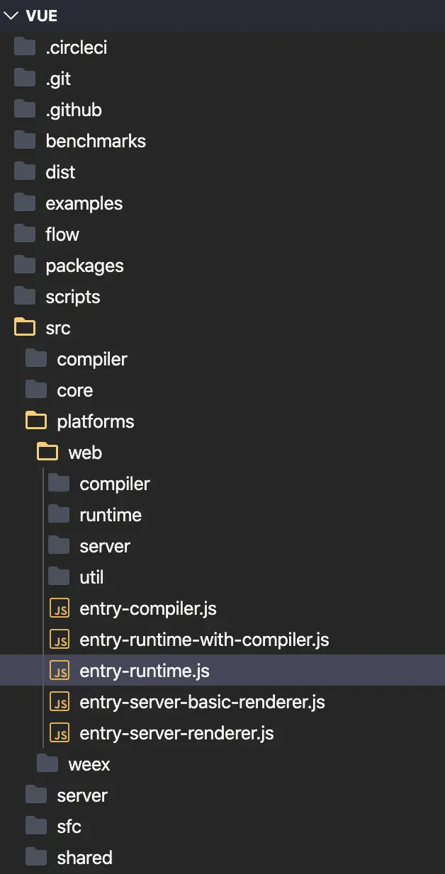 噢看到这里恍然大悟,实际上 aliases 也是暴露出一个对象,对象的 key 就是我们刚刚传入的 web ,然后又调用了 resolve ,可以看到它调用了 path.resolve,这是 Node.js 提供的解析路径的方法,__dirname 是当前根目录,通过 ' ../ ' 往上一级就到了 VUE 的 源码根目录,然后通过传入的字符串找到了 ' src/platforms/web ', 然后 resolve 函数通过 path.resolve(aliases[base], p.slice(base.length + 1)) 就能 找到最终的文件。