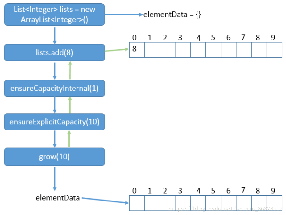 每个ArrayList实例都有一个容量,该容量是指用来存储列表元素的数组的大小。默认初始容量为10。随着ArrayList中元素的增加,它的容量也会不断的自动增长。