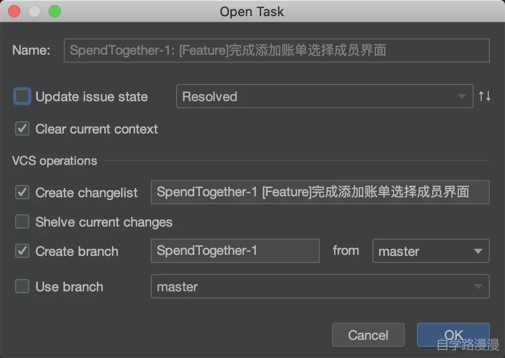 选择一个 issue 之后,本地就会直接切换到新的 Git 分支,并且激活到相应的 Changelist。