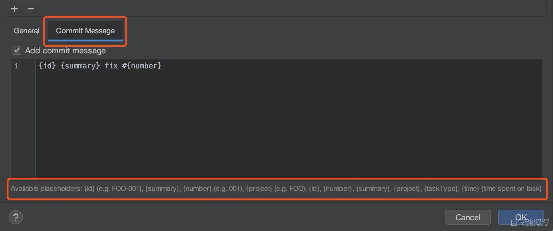 在这里勾选上 Add commit message 后,就可以编写你自己的模板了,输入框下面有提示魔法值变量,像我这样配置,最后提交的时候就会根据选择的 issue 自动生成: