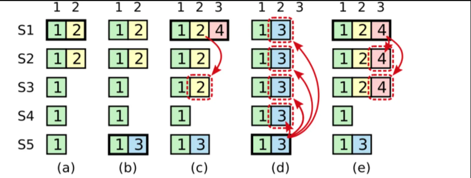 1、在a状态下,S1为leader,当前的term=2,只是完成了部分日志写入(没有同步到s3/s4/s5),这个时候S1被下线了。