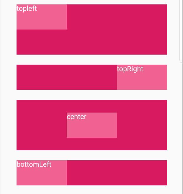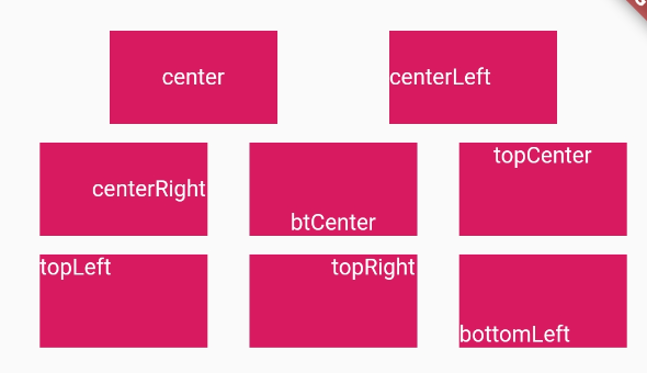 Align是一个对齐控件,能将子控件所指定方式对齐,并根据子控件的大小调整自己的大小。所以它是一个布局组件,类似于为子view设置layout_gravity,这个align值一共有九种: topLeft、 topCenter 、 topRight、 centerLeft 、 center、 centerRight 、 bottomLeft、 bottomCenter、 bottomRight 。 具体展示如下,其中每一个布局如下