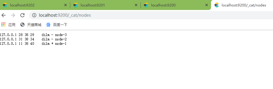 启动之后在浏览器输入http://localhost:9200/_cat/nodes验证一下,三个节点构成的集群就出来了。
