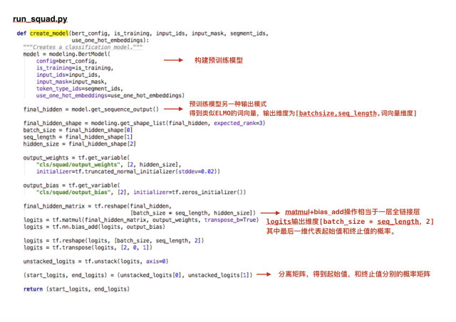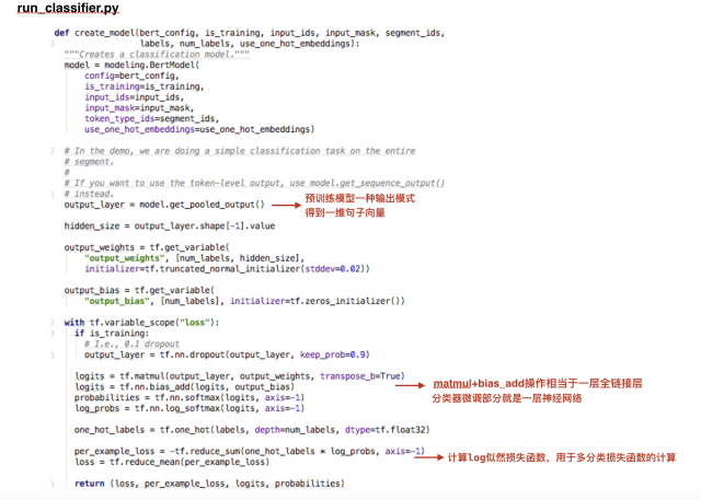 2.两个微调模型run_classifier.py和run_squad.py的create _model 部分核心代码。