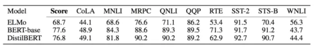 DistillBert在GLUE数据集上的表现