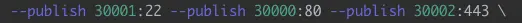 --publish 30001:22 --publish 30000:80 --publish 30002:443 \