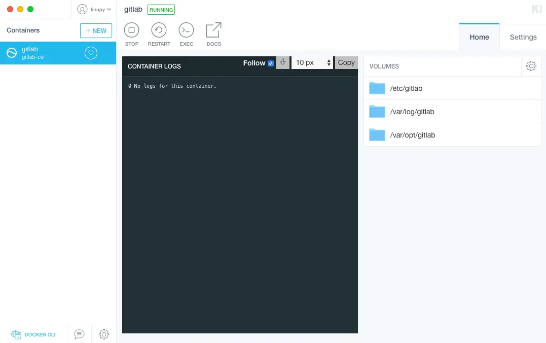 其中 volume 选项将 gitlab 的目录挂载为用户当地目录,以免容器在停止或被删除的时候丢失数据。publish 选项将宿主机器的 30000、30001 和 30002 映射为容器的 80(http)、22(ssh)和 443(https)端口。