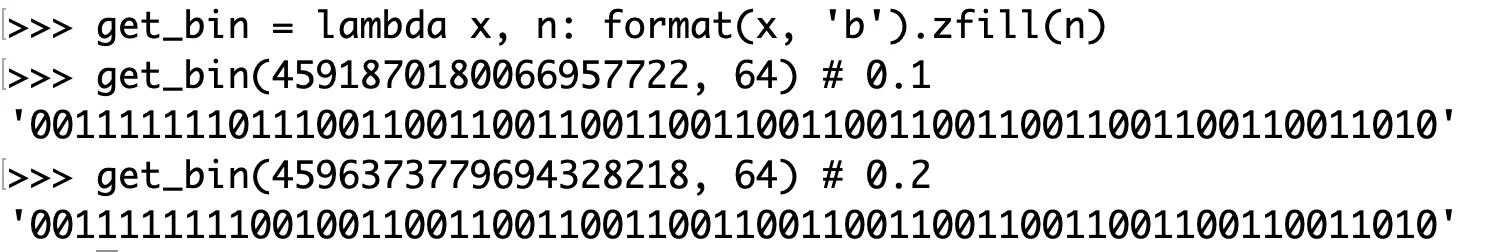 可以看到,0.1的存储实际上是大了0.55e-17,而0.2大了1.11e-17,两个相加由于二进制相加时阶码要对齐(0.1进阶末位是1,进了一位,详细过程推导可见:为什么0.1 + 0.2不等于0.3?),导致精度舍入,所以最后结果便为了4e-17。