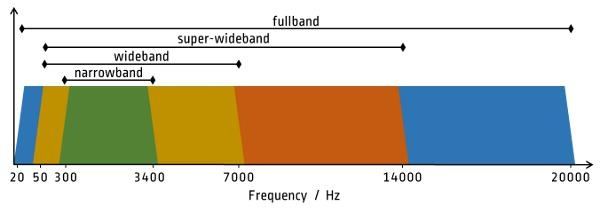 根据人声语音的特点,人类的听力感知范围是从20Hz到20kHz。这个频宽范围被划分成四个频宽类别:窄带、宽带、超宽带和全带。