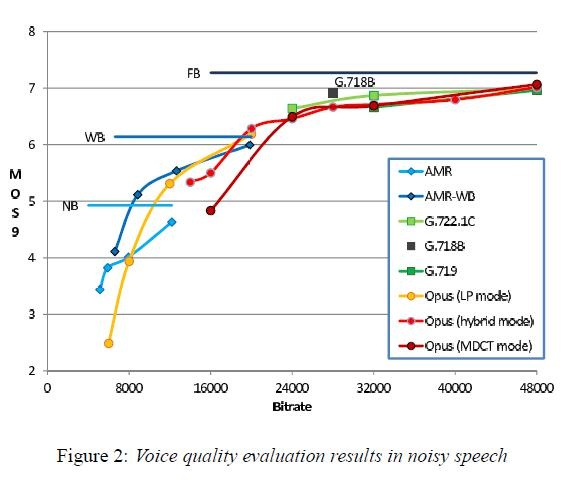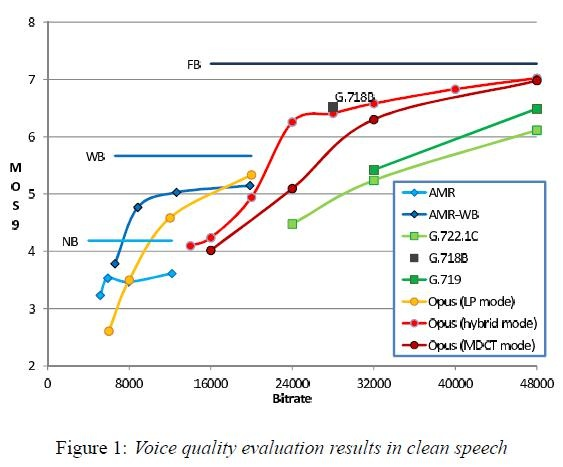 综合上面的两个图,我们可以大致总结,比较适合人声短语音的音频编解码器包含Opus(SILK)、Speex(NB,WB)、AMR-NB、AMR-WB、iLBC、G.729、和G.729.1。