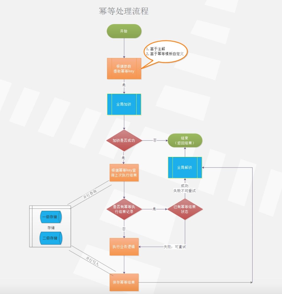 二级存储并行查询会返回查询最快的幂等结果。 二级存储并行异步写入,进一步提高性能。 高可用的幂等写入、查询能力:幂等存储出现异常,不影响业务正常流程,增加容错 distributed-tools 幂等组件支持二级存储,为了保证其高可用,毕竟二级存储出现故障的概率太低,不会导致业务上不可用,如果二级存储同时出现故障,业务上做了一定的容错,针对不确定性的异常采取重试策略,会执行具体幂等方法。 一级存储与二级存储的写入与查询处理进行隔离,任何一级存储的异常不会影响整体业务执行。 在了解了 distributed-tools 组件幂等之后,接下来我们来看下如何去使用幂等组件,首先了解下 common-api 提供的幂等注解,具体幂等注解使用方式如下: