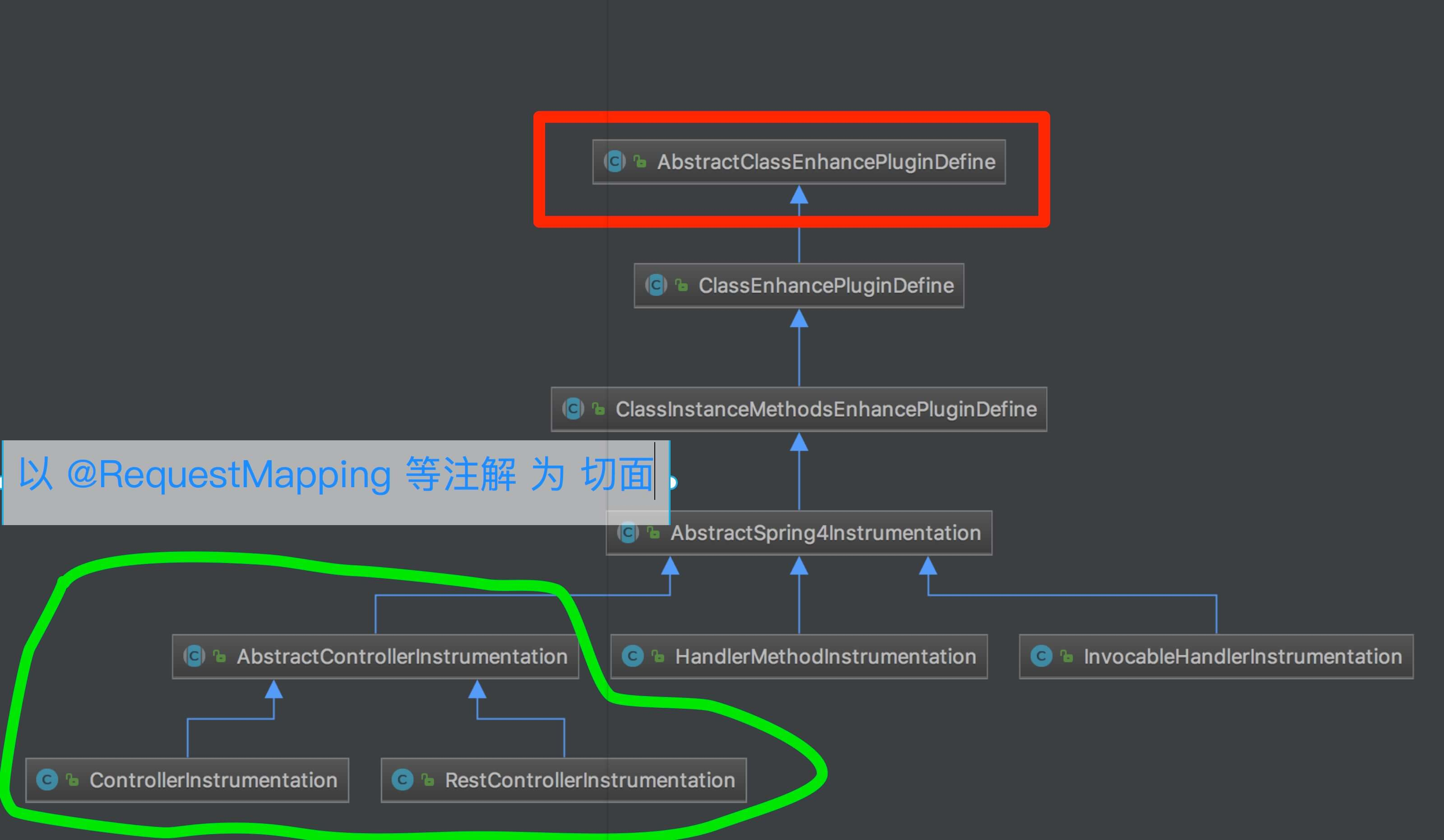 @RequestMapping注解定义 URL ,所以【第 84 行】会匹配到AbstractSpring3Instrumentation/AbstractSpring4Instrumentation两个。当应用使用的是 Spring MVC 4 时,调用AbstractSpring3Instrumentation#define(...)方法会返回空,而调用AbstractSpring4Instrumentation#define(...)方法会有返回值。这是如何实现的呢?本文 「4. 插件的拦截」 也会详细解析。