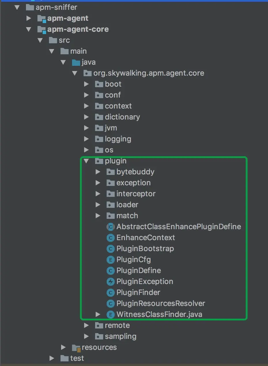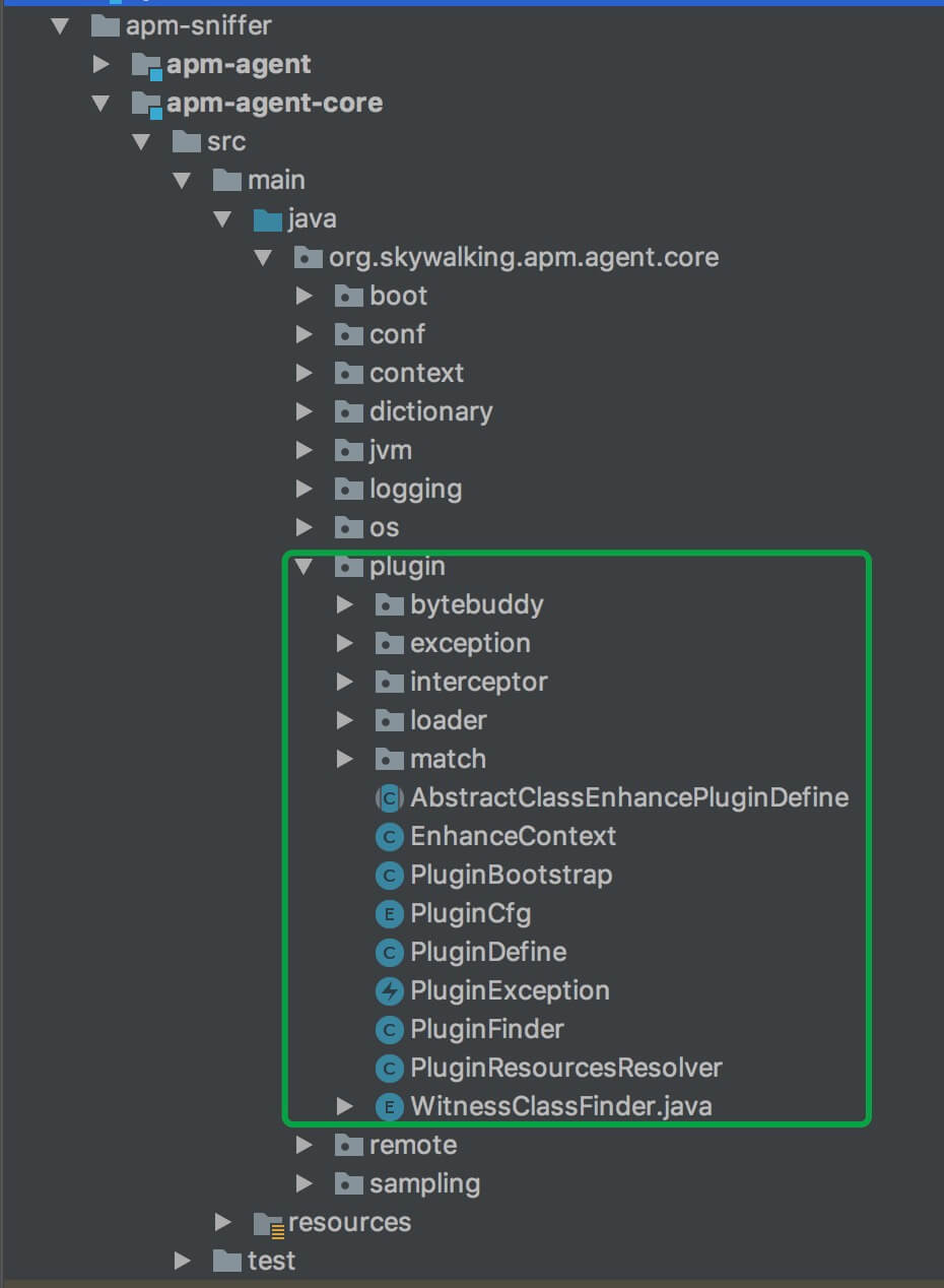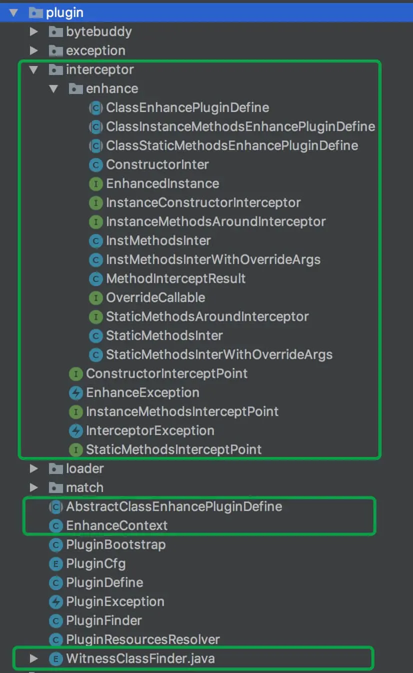本文涉及到的类主要在 org.skywalking.apm.agent.core.plugin 包里,如下图所示 :