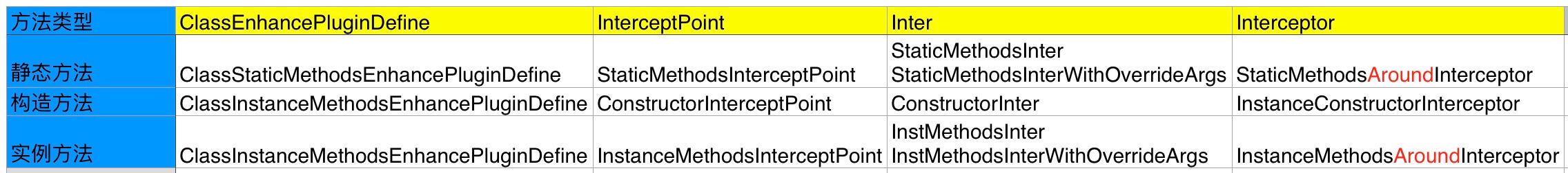 #getStaticMethodsInterceptPoints() 抽象方法,获得 StaticMethodsInterceptPoint 数组。#getConstructorsInterceptPoints() 抽象方法,获得 ConstructorInterceptPoint 数组。#getInstanceMethodsInterceptPoints() 抽象方法,获得 InstanceMethodsInterceptPoint 数组。