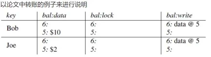 典型的二阶段提交,主要分为两个阶段,第一阶段是prewrite阶段,这个阶段做的事情主要是加锁和写入数据。第二阶段为commit阶段。 对于任何一列数据C都会被映射为三个列(属性),C:data数据本身,C:lock记录锁信息,C:write用于记录提交版本。