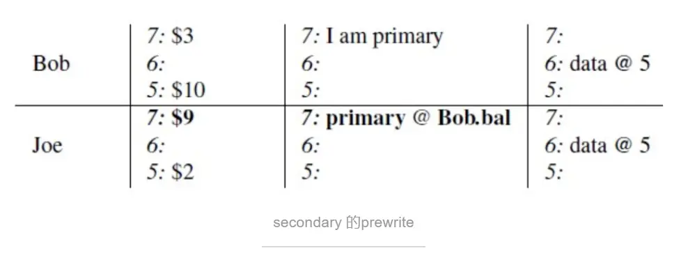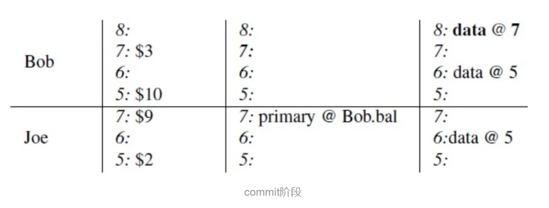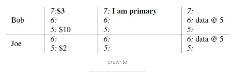 b.这个时候对数据进行了修改,然后进行提交。首先进入commit的第一个阶段prewrite阶段,从TSO中获取一个版本7,这里有两个写入,一个是bob的写入一个是joe的写入,在这里随机选择了bob为primary。检查7~max是否有写写冲突,检查lock列上面是否有锁,从初始状态下可以得知没有写写冲突,lock列上面也没锁的存在。于是对数据进行写入,然后对lock列进行写入。版本7对应的write列为空是因为这个版本是在prewrite阶段进行的,还没做commit。