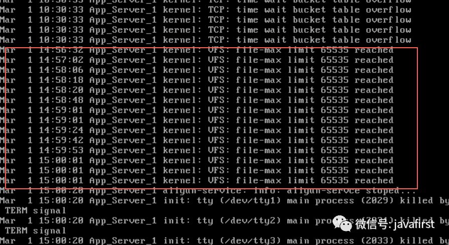 接着往下看系统内核日志,发现了和“open too many files”呼应的错误,“file-max limit 65535 reached”意思是,已到达了文件限制瓶颈。这里保持怀疑,继续收集其他信息。
