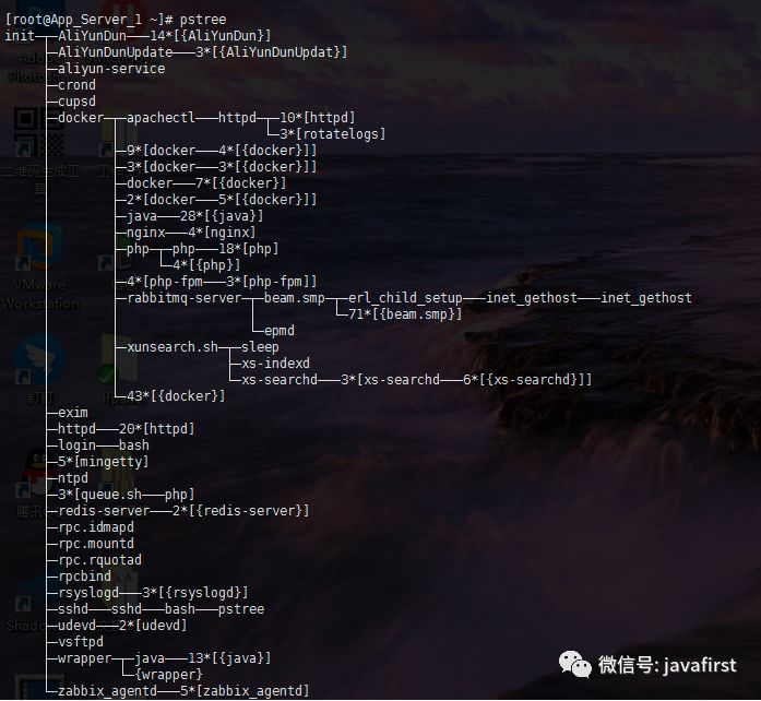3)用pstree查看打开进程,ps aux|wc-l看看有没有特别多的进程。虽然zabbix监控上说没有,但是我们要检查一下看看有没有异常的进程名字。