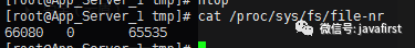 6)各项参数都正常,现在聚焦在打开的文件数这个问题上面。也可以用另外同一种方式查看一下内核统计文件 /proc/sys/fs/file-nr,比较一下差异,看看能不能找出问题。cat了一下,打开文件数是66080,果然超了!内核日志就以这个为标准。