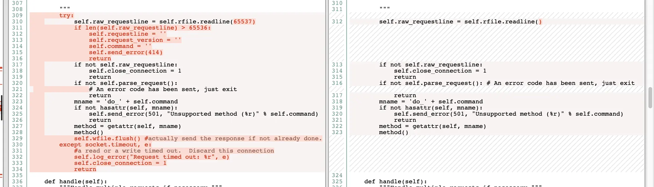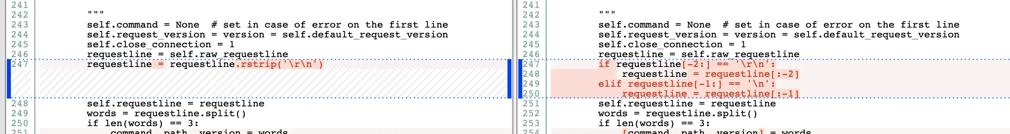 不过2.6/2.7的SimpleHTTPServer.py没有明显差异,继续再比对他们的父类:BaseHTTPServer.py