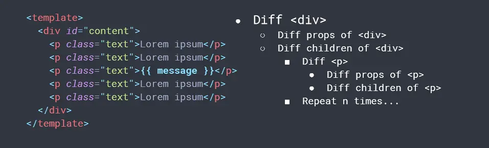 数据变更之后,新的Virtual DOM和旧的Virtual DOM进行 patch 算法比较,并算出二者之间的差异,将差异进行修改。但是传统Virtual DOM,进行算法比对时颗粒度是组件,每个组件作为一个颗粒。