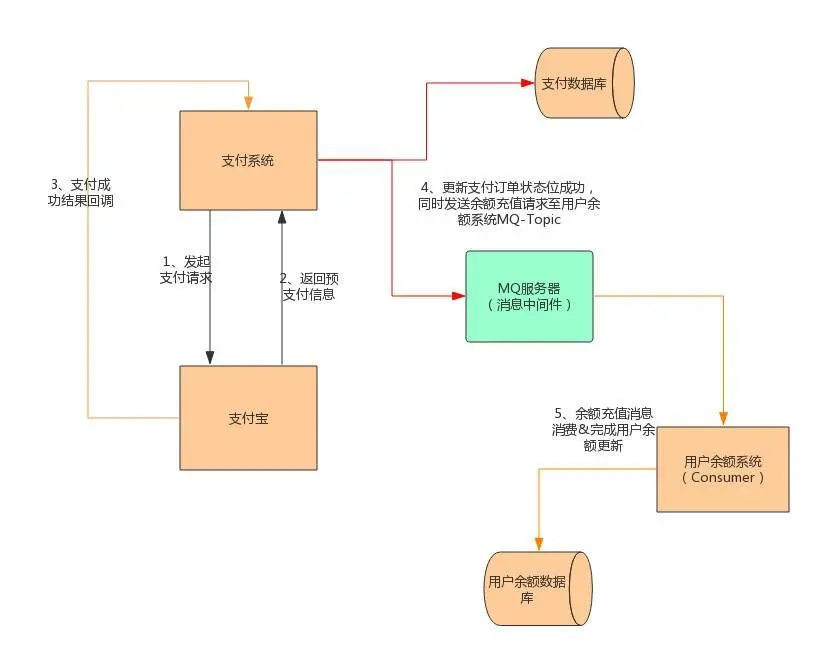 在这个设计流程中,该公司通过自建支付系统完成用户Joe的支付宝扣款操作,成功后需要更新支付流水的状态,因为用户的余额账户系统与支付系统之间通过MQ解耦了,所以支付系统在完成支付流水状态更新后需要通过发送MQ消息到消息中间件服务,然后用户余额系统作为消费者通过消息消费的方式完成用户余额的增加操作。